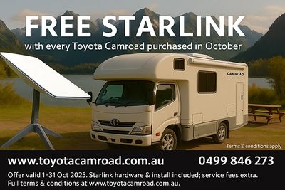 Terms & Conditions: Offer valid for a Toyota Camroad motorhomes purchased from our dealership and delivered between 1 October and 31 October 2025. Each eligible purchase includes one (1) Starlink hardware kit supplied and professionally installed by our compliance centre at no additional cost. Internet subscription plans and ongoing Starlink service fees are the responsibility of the purchaser. Offer available while stocks last and cannot be combined with other promotions. Dealer reserves the right to amend or end this offer at any time.