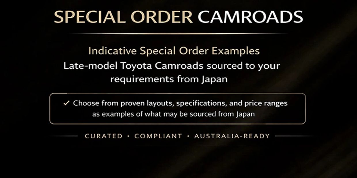 Want a late-model Toyota Camroad sourced to your requirements and professionally prepared for Australian handover, subject to compliance and registration requirements? Our Special Order Program is designed for buyers who want a clear process, quality sourcing, and professional handover from our Arundel, Gold Coast yard.